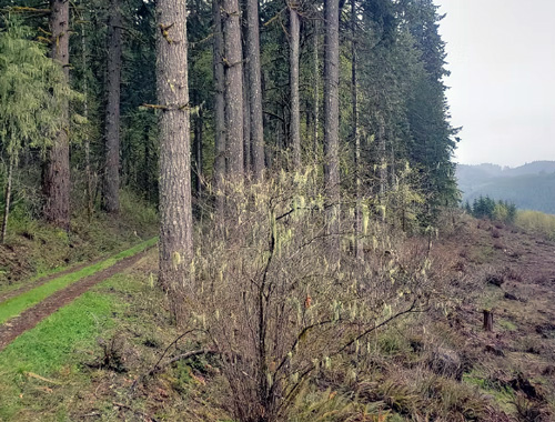 The edge of the watershed and private timber land illustrates the abundance of early seral habitat on the landscape and the importance of maintaining old trees and closed canopies on publicly owned land.