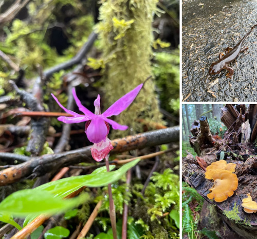 The downsides to spring logging are numerous. Aside from the damage to nesting birds and the potential for sediment runoff into streams, many other species are at their most vulnerable this time of year too. This includes wildflowers like these Calypso Orchids blooming in the project area. Amphibians like this rough-skinned newt, Pacific tree frogs and others. As well as numerous mammal species like Flying squirrels, Dusky red tree voles and the Pacific Marten which depend on the complex closed canopy forest stands like these. Residual trees are also at their most sensitive to bark damage by the logging operation this time of year. For these reasons Corvallis committed to only log during the dry season in the CFSP: