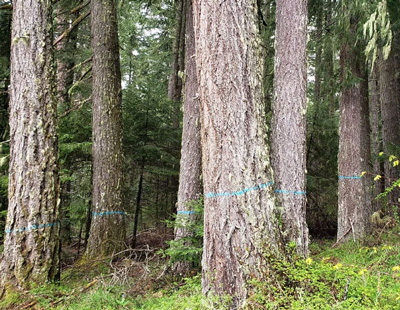A patch cut of 3-4+’ diameter fir trees almost certainly upwards of 200 years old marked for removal. This stand has complex canopies, platform branches and multiple habitat features that do not meet with the stated “restoration” priorities in the Harvest plan. This stand is is area designated O3 Old Growth, Remnant by the CFSP and outside the proposed harvest boundary.