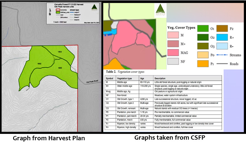 Trout Mountain Forestry, who also helped prepare the Corvallis Forest Stewardship Plan (CFSP) in 2006, originally identified this area north of the C2C trail and Old Peak Rd. (polygon 1803) as a 110-200 year old stand. When preparing the 2021-2022 harvest plan, the same area is represented as 60-100 year old forest with occasional 200+ year old individual trees. Actual trees marked for harvest include trees in the O3 category (Natural Old Growth Remnant Stands) well outside the proposed harvest boundary. Conversations with the Public Works liaison on this project indicated there was no upper size or age limit on trees to be removed during this harvest. Trout Mountain representatives also reached out to make sure it was clear that there are no restrictions in the CFSP on harvesting 110-200 year old trees.