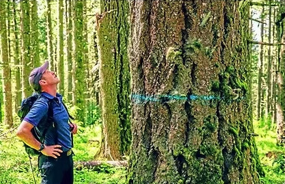 Doug Pollock stands next to an old-growth tree for scale while gazing upward. The blue marking indicates that this tree is set to be cut and harvested.